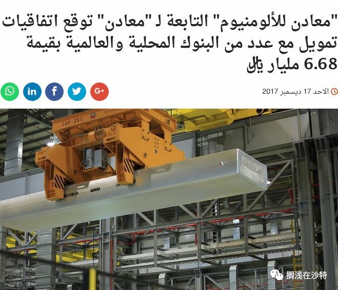 来自沙特经济报的消息,2017年12月14日,沙特矿业宣布成功与沙特本地多家银行达成铝矿冶炼项目融资协议,融资总额达到18亿美金,为2030愿景沙特铝矿业的发展计划提供了雄厚的资金保障。