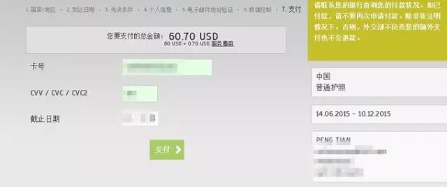 8、点击确认后,进入第二部分收费选项页面,如下图:实际上需要支付的费用除了签证费60美金外,还需要多付0.7美金的手续费,共USD60.7,需要填写信用卡号、CVV/CVC/CVC2三位数的安全码,即卡背面后三位数字、信用卡截止日期月年。