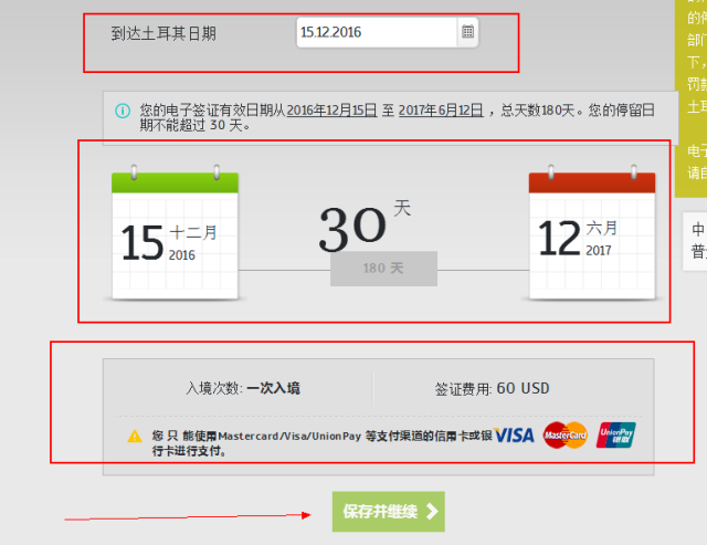 3、点击保存继续后,到达土耳其电子签证到达日期选择页面。进入以下页面,目前中国公民通过网上电子签可获取的是30天单次入境签,有效期为半年,即180天,请根据自己的实际行程情况选择到达土耳其的日期,根据以往的经验,建议大家选择的日期比实际到达土耳其当地时间早个1到2天,甚至提前几天,以防行程更改,需要提前到达,反正时间还多的是哈哈,页面上面会清晰的帮您计算出签证的有效期180天的起始和截止日期,在此期限内,任何一天单次入境土耳其,入境停留时间不得超过30天。