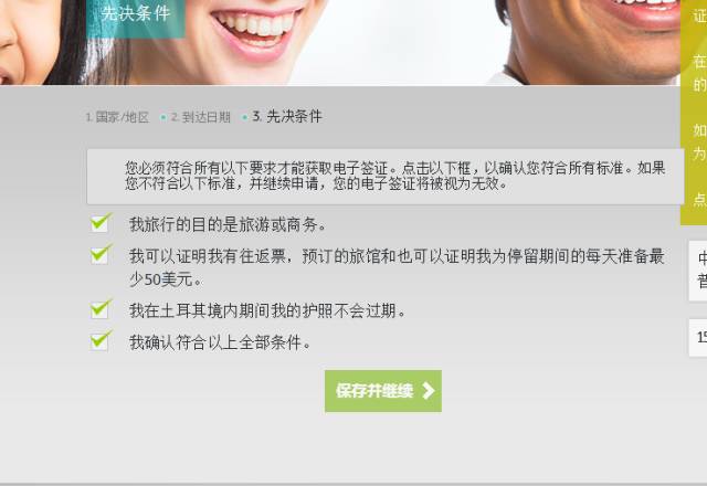 4、点击保存并继续到达土耳其电子签证先决条件页面,先决条件页面请注意把全部选项都打上钩,方能继续下一步,页面当中有提示到。